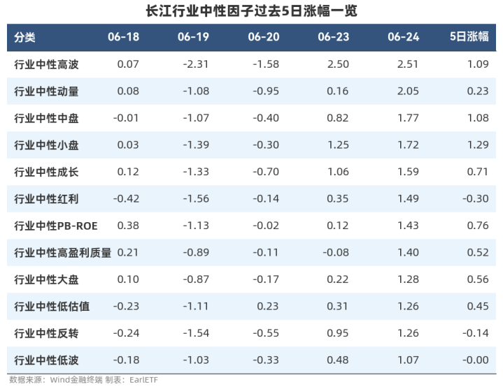 从长江证券战略数据组公布的行业中性因子指数来看,表现最好的三个因子的依次是高波、动量、中盘,表现最差的三个因子依次是低波、反转、低估值。