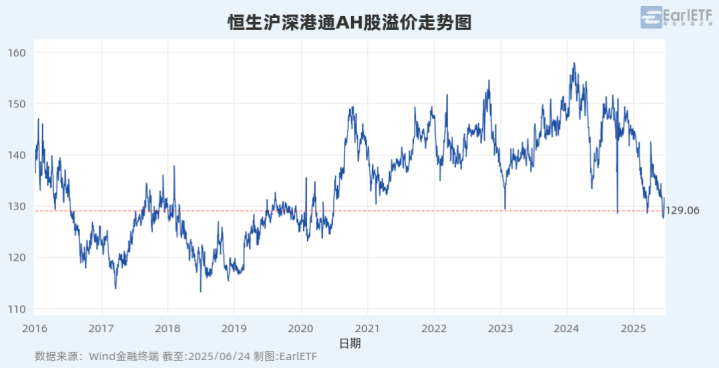 恒生AH股溢价指数是一个体现同时在A股和港股(H股)上市的公司,A股相较H股的溢价水平。此指数最新值为129.06点,较前-1.22点。代表上述公司A股相较H股溢价率为29.06%。最近数值高于过去五年0.74%的交易时间。注:为规避A股休市带来的数据波动,下图仅显示A股交易日数据。