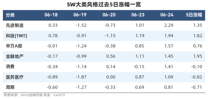 申万大类风格是申万指数将大类行业聚类成6个风格,通过将它们与申万A股指数的对比,可以一目了然知道目前哪个大类风格领涨。