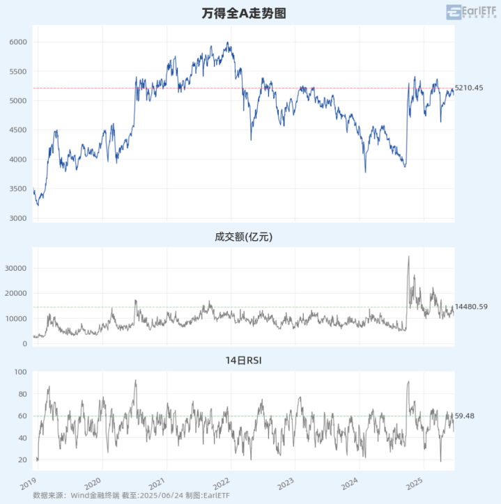 6月24日,万得全A指数涨跌幅为+1.56%,成交额为14480.59亿,相较上一交易日变动为+3011.36亿。
