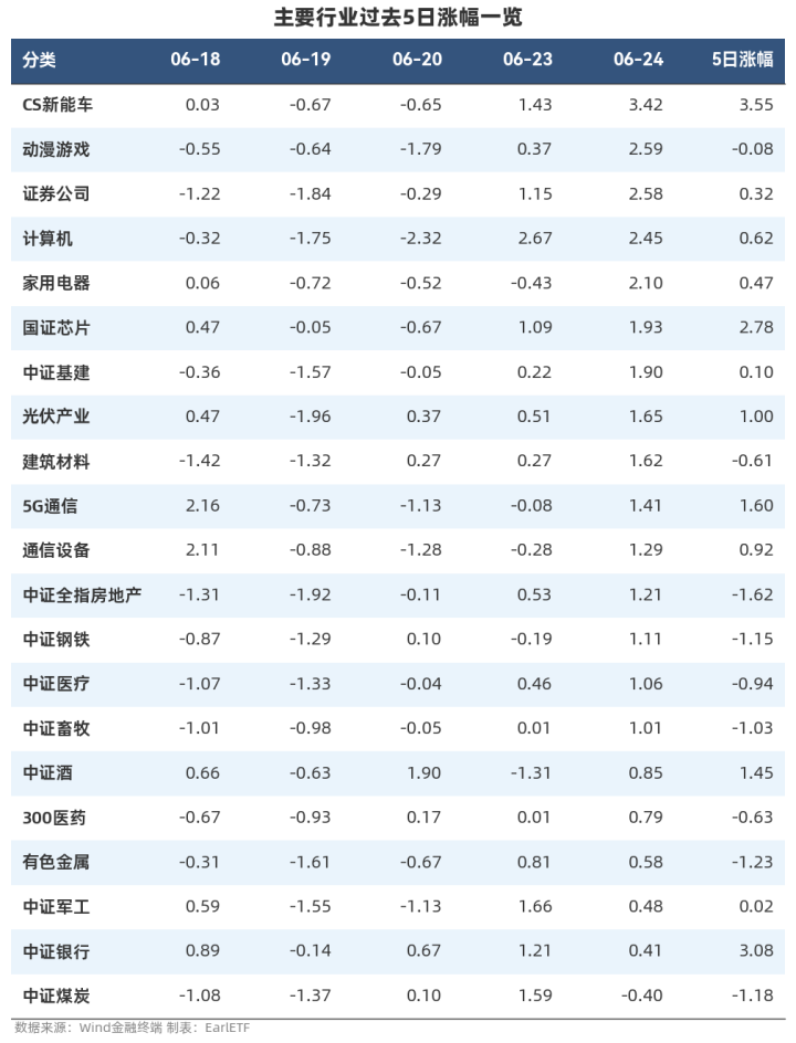 主要行业指数中,6月24日表现最好的是CS新能车,涨跌幅为+3.42%,表现最差的是中证煤炭,涨跌幅为-0.40%。